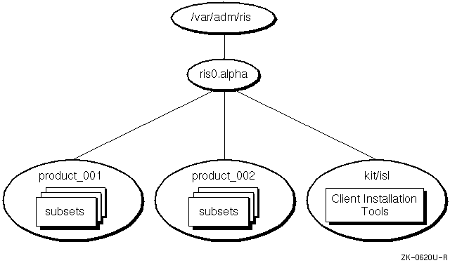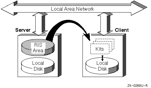 In the RIS area, the server maintains information about what software kits the clients can access. Kits are organized so that a software product can supply several different versions to allow for the differences between multiple hardware platforms (such as Digital UNIX on Alpha systems, ULTRIX MIPS, etc.). The server's RIS area is made available for read-only access to clients by means of the Network File System (NFS) .