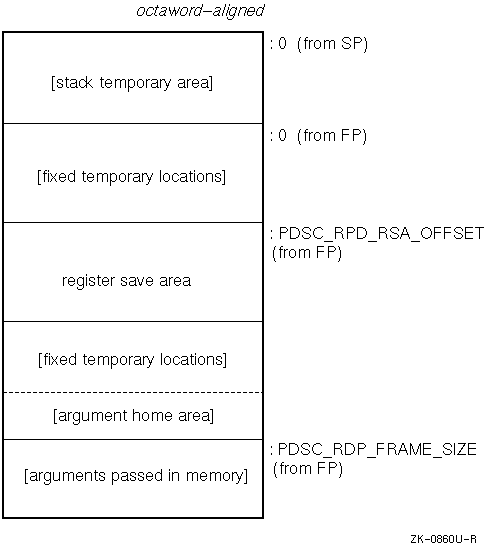 area pointed to by the frame base register added to the value of PDSC_RPD_FRAME_SIZE can be used for a special purpose referred to as the argument home