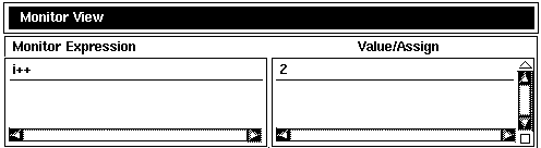| Monitor | In the Monitor View, displays the name and current value of a variable that you have selected in a window. Whenever the debugger regains control from your program, it automatically checks the variable and updates the displayed value accordingly. |