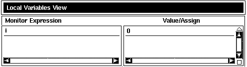 | Local Variables | Lists local variables and parameters passed to a routine. If you change the Call Stack level, this view is updated to show the variables at the routine in the given stack. When a new routine is detected at the top of the stack, all variables for the previous routine are removed and variables for the new routine are displayed, (see Section 4.5.4.1). |