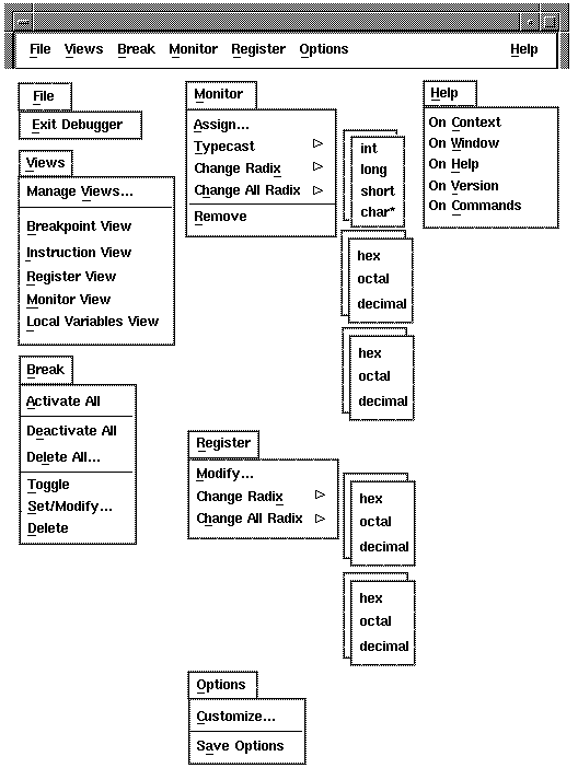 | Options | Customize... | Modifies, adds, removes, or resequences a button in the push-button panel and the associated debugger command (see Section 4.9.1). |