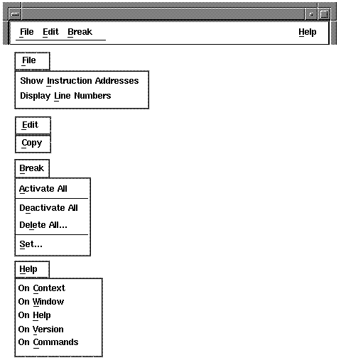 | Set/Modify Breakpoints... | Displays a dialog box you can use to activate or deactivate a breakpoint and modify the breakpoint attributes (location, condition, or action). |