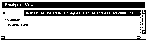 Double clicking on an entry in the Breakpoint View expands the one-line entry into a description of the action and condition (if any) that are currently associated with the breakpoint, whether or not the breakpoint is active or deactivated (see Figure 4-6).