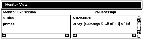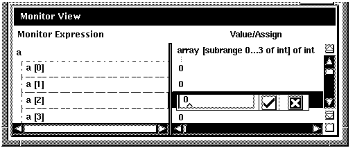 If you select the name of an aggregate variable such as an array or structure (record) and click on the Monitor push button, the debugger displays the full type name of the aggregate in the Value /Assign column of the Monitor View. To display the values of all elements (components) of an aggregate variable, double click on the variable name in the Monitor Expression column.
