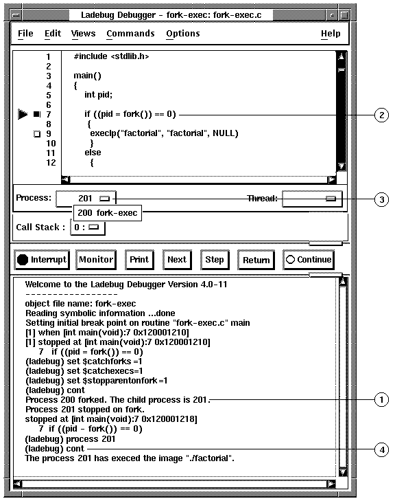 Ladebug provides predefined debugger variables that you can set in order to debug multiprocess applications that fork and/or exec. In the example in Figure 5-2, the debugger variables $catchforks, $catchexecs, and $stopparentonfork have been set from the prompt as follows: