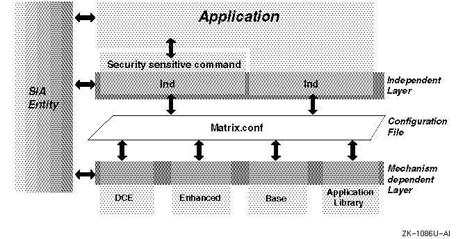 The security-sensitive commands have been modified to use the mechanism-independent sia_*() routines. The routines are used by the commands and utilities to access security functions yet remain isolated from the specific security technologies. The sia_*() routines call the associated mechanism-dependent siad_*() routine, depending on the selected configuration specified in the matrix.conf file. See Chapter 13 for a more detailed discussion of the file.