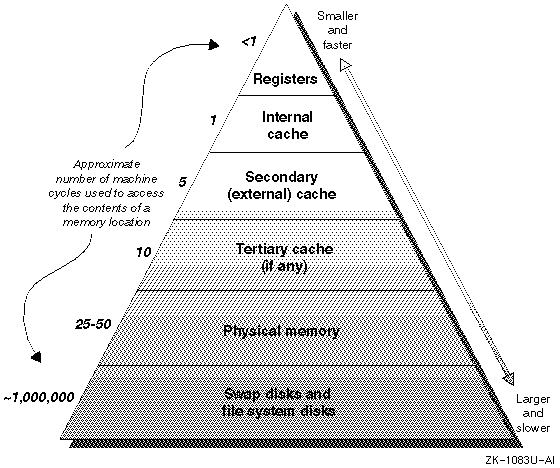Movement between caches and physical memory is significantly faster than movement between disk and physical memory, because of the relatively slow speed of disk I/O. Therefore, avoid paging and swapping operations, and applications should utilize caches when possible. Figure 4-3 shows the amount of time that it takes to access data and instructions from various hardware locations.