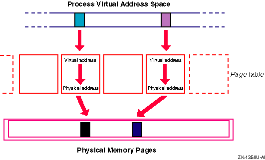 When a virtual page is touched or accessed, the virtual memory subsystem must locate the physical page and then translate the virtual address into a physical address. Each process has a page table, which is an array containing an entry for each current virtual-to-physical address translation. Page table entries have a direct relation to virtual pages (that is, virtual address 1 corresponds to page table entry 1) and contain a pointer to the physical page and protection information.