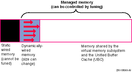 At boot time, the operating system and the Privileged Architecture Library (PAL) code wire a contiguous portion of physical memory in order to perform basic system operations. Static wired memory is reserved for operating system data and text, system tables, the metadata buffer cache, which temporarily holds recently accessed UNIX File System (UFS) and CD-ROM File System (CDFS) metadata, and the Advanced File System (AdvFS) buffer cache. Static wired memory cannot be reclaimed through paging. You can reduce the amount of static wired memory only by removing subsystems.