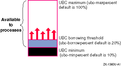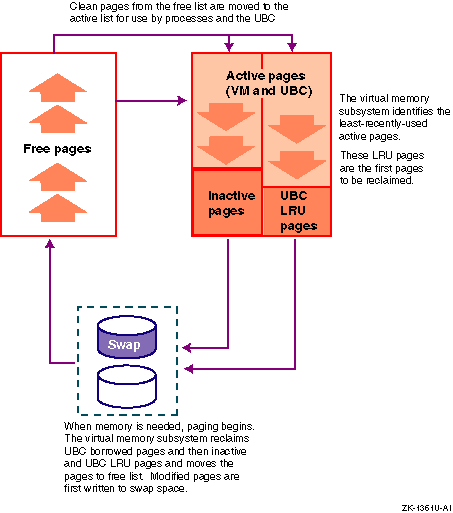 The virtual memory subsystem and the UBC compete for the physical pages that are not wired. Pages are allocated to processes and to the UBC, as needed. When the demand for memory increases, the oldest (least-recently used) pages are reclaimed from the virtual memory subsystem and the UBC and reused. Various attributes control the amount of memory available to the virtual memory subsystem and the UBC and the rate of page reclamation. Wired pages are not reclaimed.