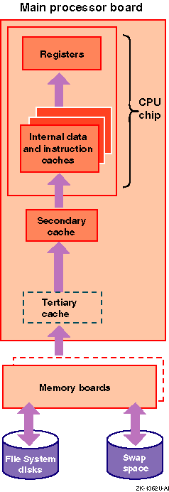 When programs are executed, the system moves data and instructions among various caches, physical memory, and disk swap space. Accessing the data and instructions occurs at different speeds, depending on the location. Table 4-1 describes the various hardware resources (in the order of fastest to slowest access time).