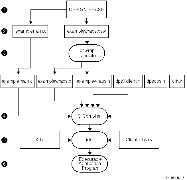 Processing examplewraps.psw with the pswrap translator produces two output files: examplewraps.c and examplewraps.h. These output files must then be compiled with examplemain.c.