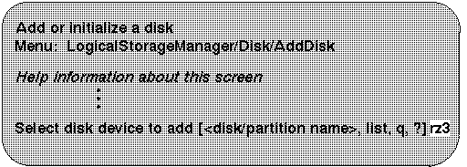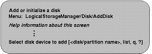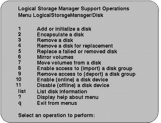 | 1 | Identifies a disk to LSM and prepares the disk for LSM use. Use this option to initialize disks that are new or that do not contain valid data. |