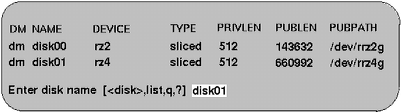 If you do not know the address of the disk you want to add, enter the letter l or type the word list at the prompt. LSM displays a list of the disks that are available as replacement disks. For example: