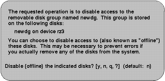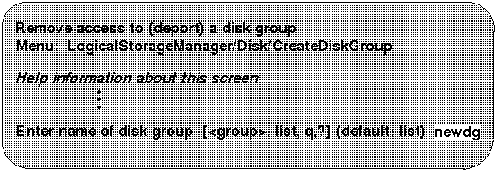 Use this menu operation to enable access by this system to a disk group. This operation can be used to move a disk group from one system to another. If you want to move a disk group from one system to another you must first disable (deport) it on the original system (see Section 9.3.2), then move the disk between systems and enable (import) the disk group.