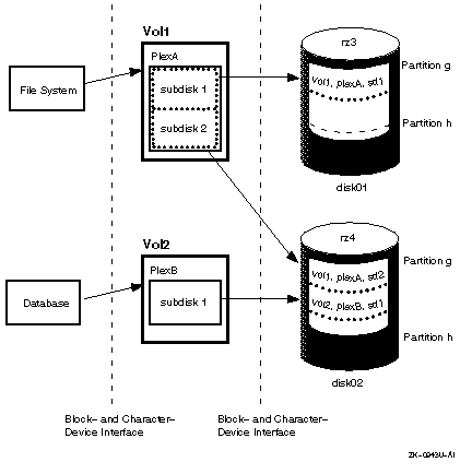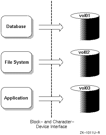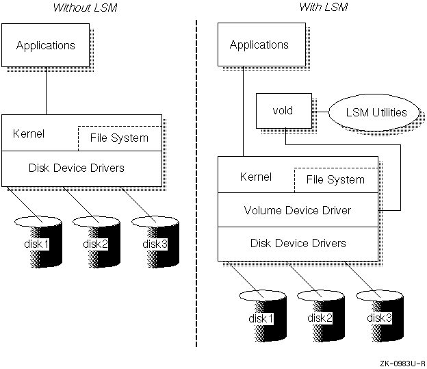 Figure 1-1 shows how disk storage is handled in systems that use LSM.