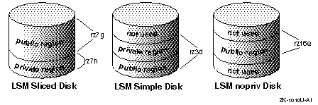 Figure 1-4 shows the private and public regions in LSM simple and sliced disks. The third disk, an LSM nopriv disk, does not contain a private region. All of these types of disks can be added into an LSM disk group.