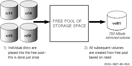 Figure 1-5 illustrates the two-step process of creating a pool of storage space and using it to create volumes as they are needed.
