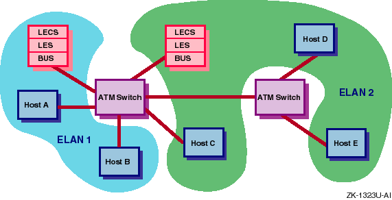 Figure 2-2 shows an ATM network with two emulated LANs. Host A and Host B are LAN Emulation Clients (LECs) on ELAN1. Host C, Host D, and Host E are LECs on ELAN2. The LECS (LAN Emulation Configuration Server), the LES (LAN Emulation Server), and the BUS (Broadcast and Utility Server) are depicted as two separate systems, although these server functions are typically resident on an ATM switch.