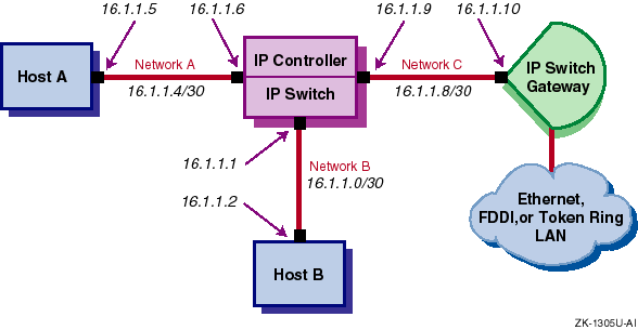 For the IP switching subnetworks, DIGITAL recommends that you use a network mask length of 30 bits. This allows for two bits for each host address, one bit for the subnetwork address, and one bit for the broadcast address. Using large netmasks helps to conserve IP address space on subnetworks that have a few hosts attached.