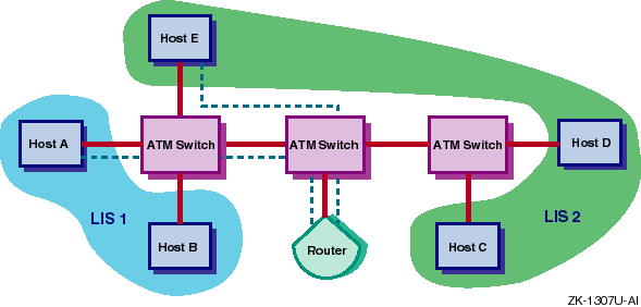 Figure 2-1 shows an ATM network with two LISs. Host A and Host B are members of LIS 1; Host C, Host D, and Host E are members of LIS 2. The figure also shows a virtual circuit (VC) between Host A and the router and between Host E and the router. Although these hosts are connected to the same switch and might establish a VC for communications between each other, they cannot because all communications to a member of another LIS must go through a router.