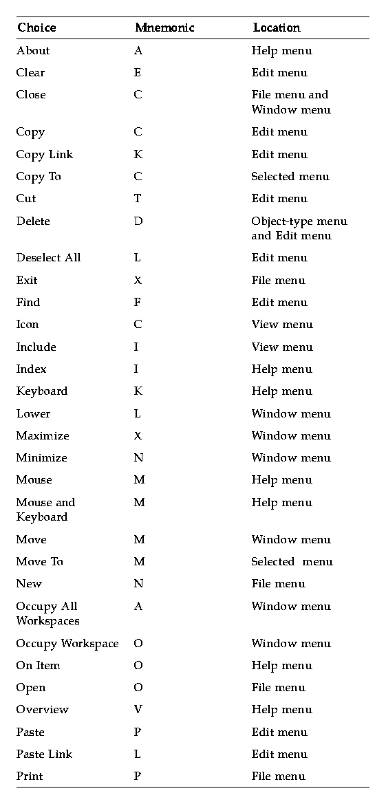 Table A-2 Mnemonic Assignments for menu Choices (continued)