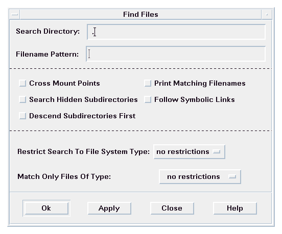 The first option menu menu pane consists of a number of push button gadgets, representing various restrictions that can be imposed upon the find command: