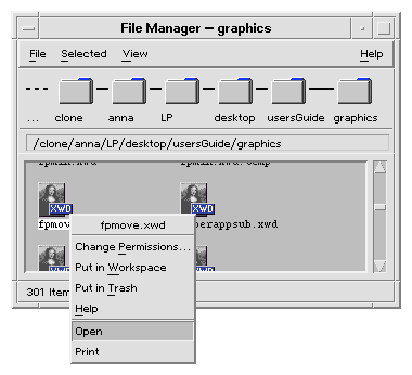 The contents of the Selected menu depends on the data type. However, many different data types provide an Open action--that is, when you select a file of that particular data type in File Manager and display the Selected menu, you see an Open command.Figure 8-6 The Selected menu for an XWD file