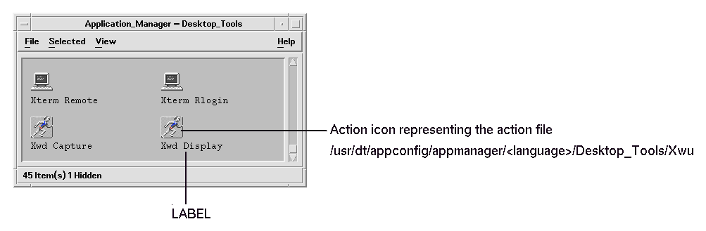 The icon labeled Xwd Display appears in the application group because there is a file in that directory named Xwud (see Figure 8-4). This file represents an underlying action with the same name--Xwud. In the action definition, the action name is the name following the ACTION keyword: