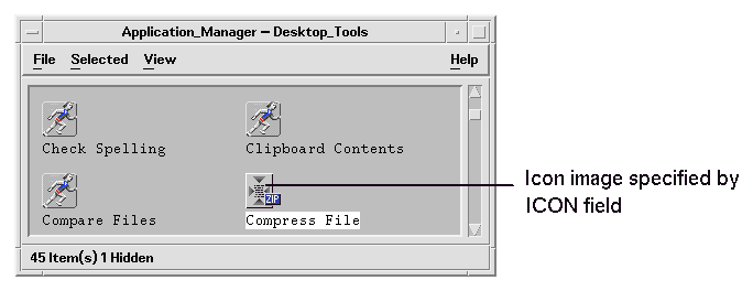 The file is called an action file because it represents an action. A file is an action file when it is an executable file with the same name as an action. Its icon in Application Manager (or File Manager) is called an action icon, or application icon, because double-clicking it starts an application.Figure 8-4 Application (action) icon representing an action file