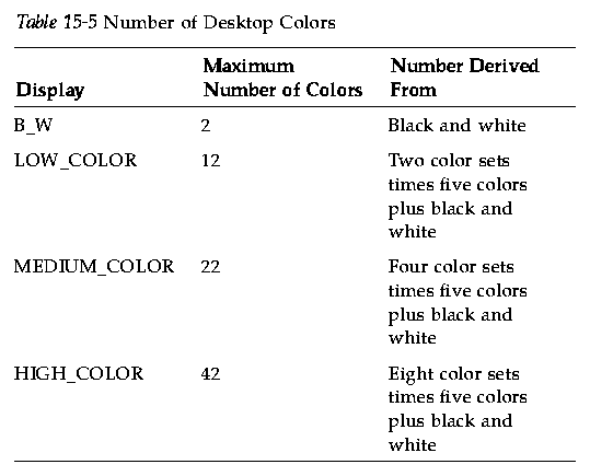 Table 15-5 lists the maximum number of colors allocated by the desktop.