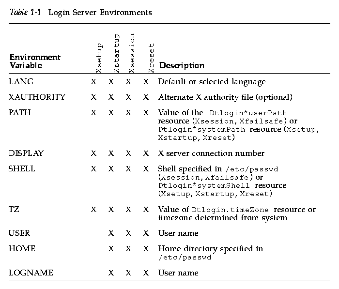 The login server provides an environment that it exports to the Xsetup, Xstartup, Xsession, Xfailsafe and Xreset scripts. This environment is described in Table 1-1. Additional variables may also be exported by the login server.