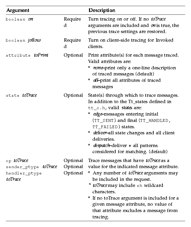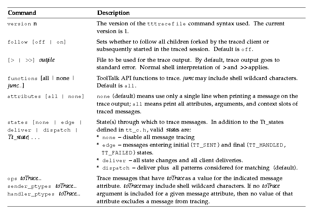 tttrace is implemented purely as a ToolTalk client, using the message interface to ttsession and the TT_TRACE_SCRIPT environment variable. If this variable is set, it tells libtt to turn on client-side tracing as specified in the trace script. If the first character of the value is '.' or '/', the value is taken to be the path name of file containing the trace script to use; otherwise, the value is taken to be an inline trace script.