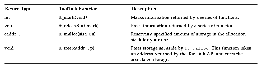 The ToolTalk service provides the calls listed in Table 13-1 to manage the storage of information in the ToolTalk API allocation stack: