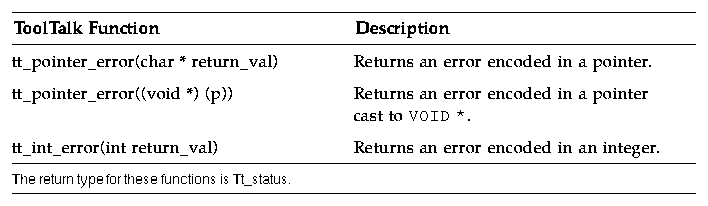 If a ToolTalk function has a natural return value such as a pointer or an integer, a special error value is returned instead of the real value.