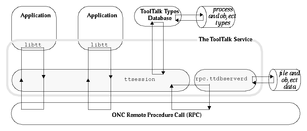 The ToolTalk service uses the ONCTM Remote Procedure Call (RPC) to communicate between these ToolTalk components.