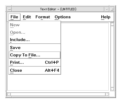 Other applications can use Text Editor as a tool to edit documents or other types of information. Under certain conditions, an application may choose to restrict your editing choices. In the example below, the File menu has been modified. The Save As command has been replaced with a Copy To File command and the New and Open commands are not available.