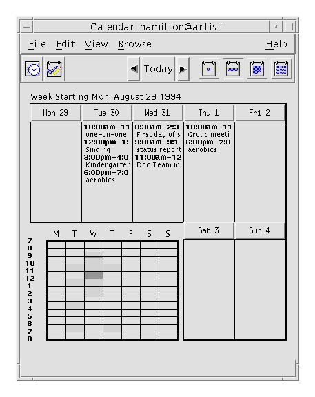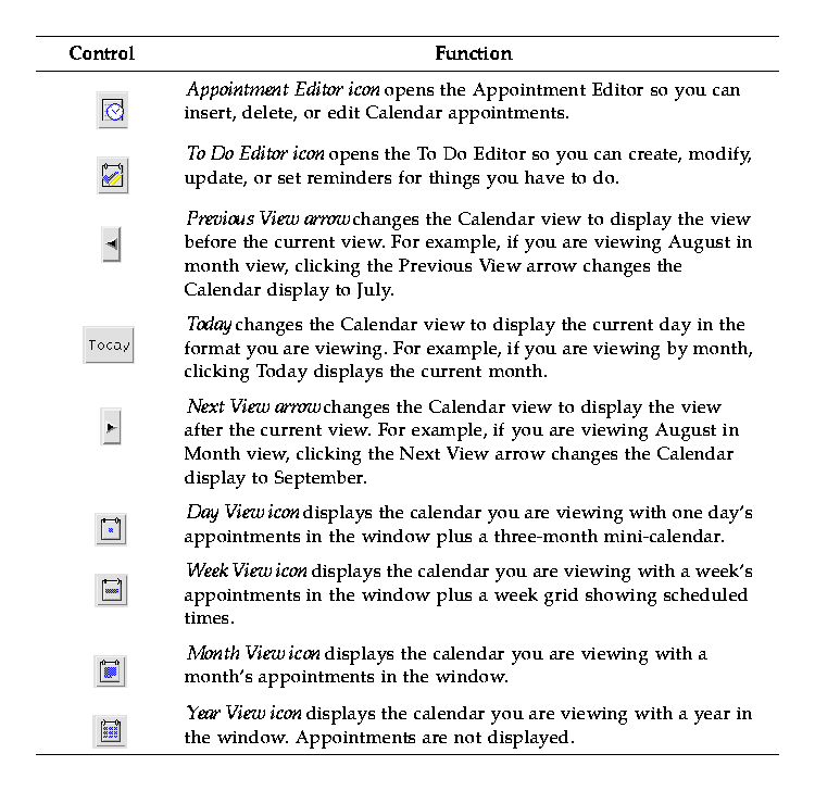 Calendar's tool bar provides controls for quick navigation through calendars. The tool bar controls and their functions are described in Table 11-1.
