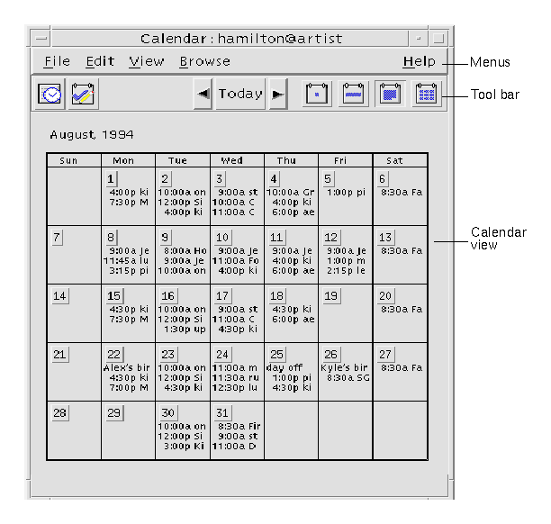 The menus and tool bar controls are at the top of the main window. The selected Calendar view is displayed in the lower part of the main window.
