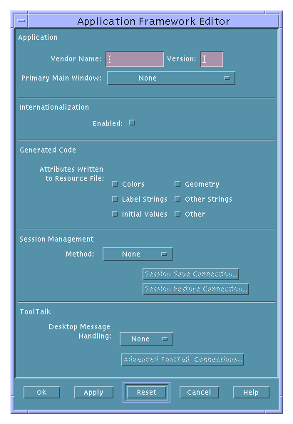 Use the Application Framework Editor to specify basic functionality in the application for internationalization, resource file attributes, session management, and ToolTalk message handling. See "To Establish Application Framework Behavior" for instructions.