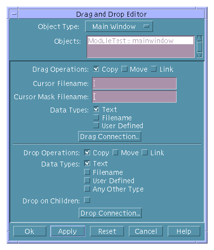 - An option menu for choosing the type of object (Control Pane, Custom Dialog, Draw Area Pane, Label, or Main Window) for which you wish to establish drag and drop behavior.