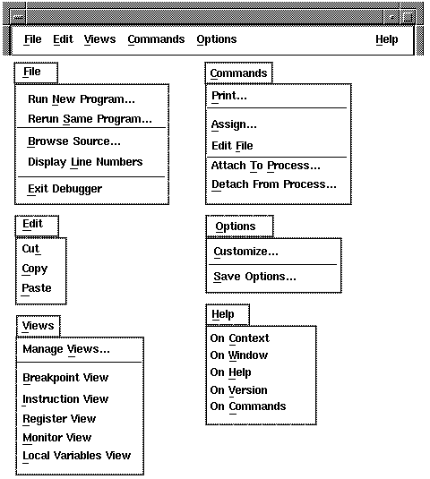 | Options | Customize... | Modifies, adds, removes, or resequences a button in the push-button panel and the associated debugger command (see Section 4.9.1). |