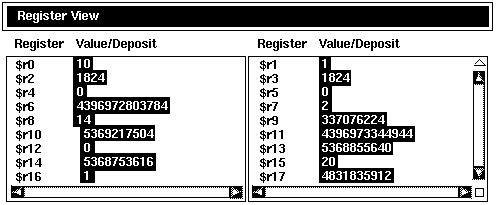 | Register | Displays the current contents of all machine registers. The debugger updates the values whenever it regains control from your program. The Register View also enables you to change the values in registers (see Section 4.7). |