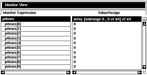 If you select the name of an aggregate variable such as an array or structure (record) and click on the Monitor push button, the debugger displays the full type name of the aggregate in the Value /Assign column of the Monitor View. To display the values of all elements (components) of an aggregate variable, double click on the variable name in the Monitor Expression column.