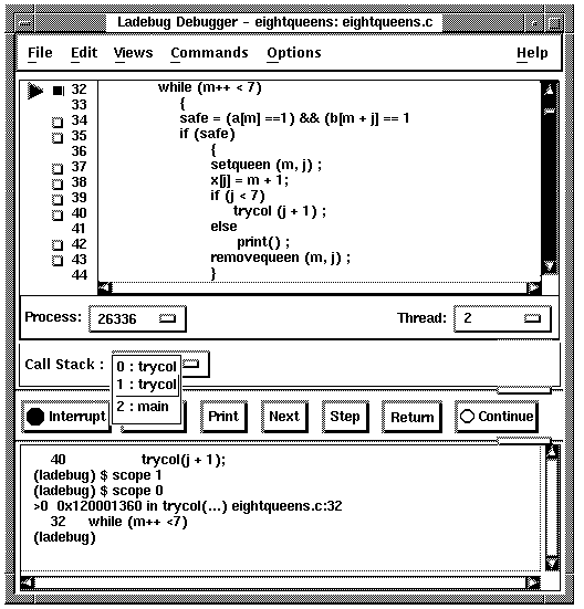 If your program does not terminate and you suspect that it is looping, click on the Interrupt button. The source display will show where you interrupted program execution, and the Call Stack menu will identify the sequence of routine calls at that point (see Section 4.3.1).