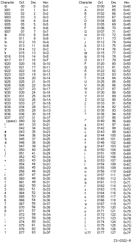 Figure C-1 shows the ASCII character set. Each character's octal, decimal, and hexadecimal value is shown.