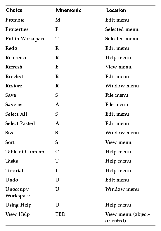 Table A-2 Mnemonic Assignments for menu Choices (continued)