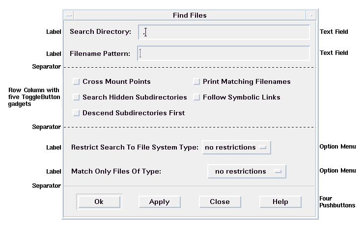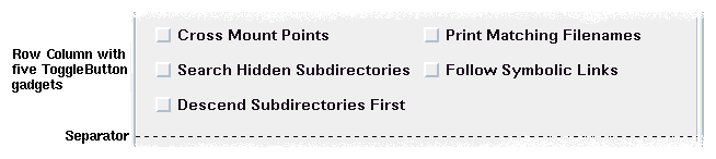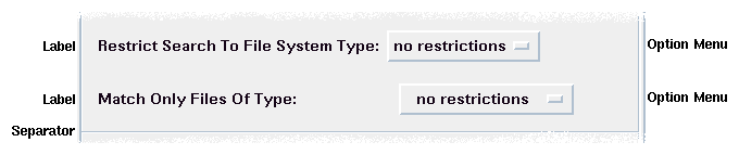 The first option menu menu pane consists of a number of push button gadgets, representing various restrictions that can be imposed upon the find command: