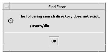 Enter the search directory and file name you're looking for in the text fields at the top of the window. In addition, select any applicable choice (or choices) from the five toggle buttons. You can further restrict the search with the option menus. When you have made all the necessary selections, click OK. If all is well, a window appears shortly thereafter and displays the results of the find operation. An error dialog appears if you don't specify a search directory or file name, or if the specified search directory is invalid. For example, suppose you want to find a file called two_letter_calls, and you think it resides somewhere in the directory /users/dlm. When you enter the directory in the Search Directory text field, you inadvertently type /users/dln instead of /users/dlm. When you click OK or Apply, script_find can't find the directory /users/dln, so it creates the error dialog to notify you of this.