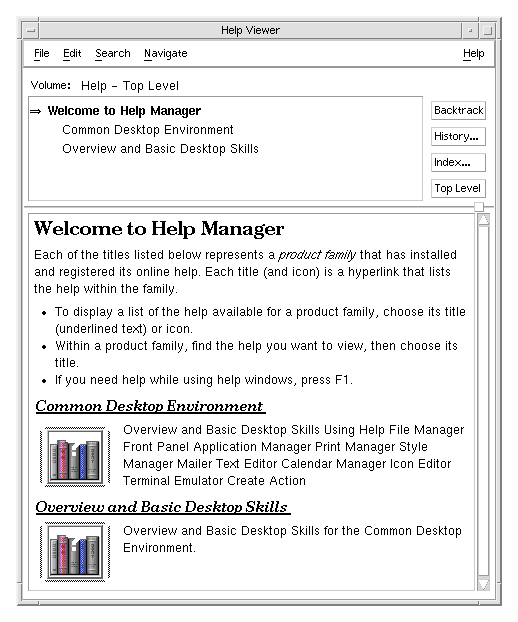 Any help volume listed in the browser volume can be viewed by selecting the volume title. Because you can display and navigate through different volumes, the browser help window includes an additional button, called Top Level. You can use this button to return to the browser list after displaying one or more volumes.